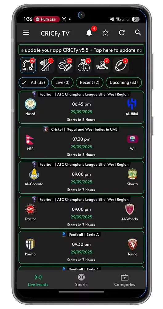 CricFy app covers a wide range of Cricket and Football events, including PSL, IPL, ICC tournaments, La Liga, UEFA Champions League, and many other matches played around the world. Everything is organized clearly, so you don’t waste time searching for streams during big games.